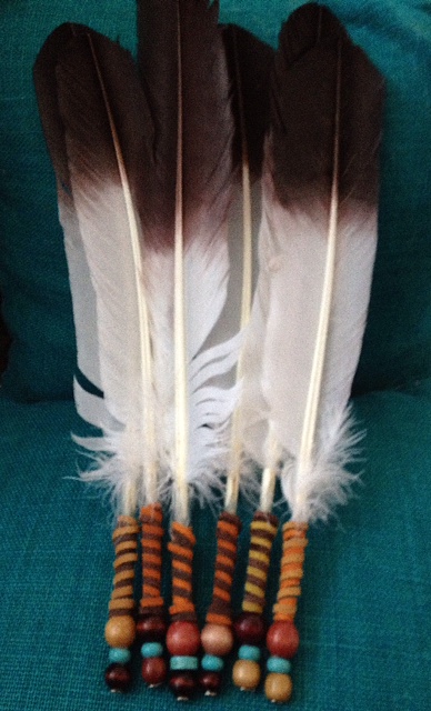 Our homemade feathers, used for wafting sage for house blessings, have handmade handles made with genuine suede and wooden & gemstone beads. They are known by the Native Americans to aid in the cleansing and purifying of auric energy when blessing a person or space. Feathers are decorative and blessed with healing prayer, Reiki energy and love.