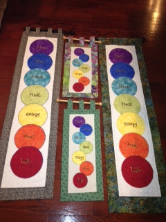 Beautiful handmade Chakra Tapestry! Bless your home with this beautiful wall art! Larger size: 42"L x 14"W. Smaller one now too! 20"L x 9" W. Gorgeous quality fabric and craftsmanship with vibrant colors representing the Chakras. Includes wooden rod for hanging. Scripted with words "Bless This House Heal Energy Heal Life in Chakra circles. New Smaller size too! 24.95!