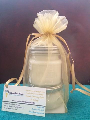 Lovely, fragrant "Blessed By Love" Candle. Made with Loving Intention, prayer, holy water, sage leaf as well a lovely fusion of citrus, cherry blossom, hydrangea, apple, peach & blondewood! Smells romantic and beautiful. Eight ounce decorative mason jar with bow! Use to bless yourself and attract the Love energy you deserve. Wonderful when used with Blessed by Love Sugar scrub for a bath/body blessing ritual.