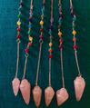 Gemstone Energy Pendulums -Our genuine gemstone energy Pendulums have a Rose Quartz pendulum and gemstones representing all the chakras in the body. Reiki practitioners use pendulums to identify energy blockages in the body. The word Reiki is made of two Japanese words - Rei which means "God's Wisdom or the Higher Power" and Ki which is "life force energy". Reiki is actually "spiritually guided life force energy." Energy pendulums are used in Reiki (energy healing) for identifying blocked energy in the body during a Reiki healing. At BTH... we infuse our pendulums with our spiritual Native American and Catholic energy prayer and holy water and sage, to create a tool for using in house blessings in a similar manner that Reiki practitioners use it in a Reiki session. See our House Blessings page to get instructions on how to use a pendulum for a house or body blessing.